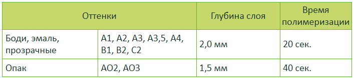 - Время полимеризации – 20 - 40 сек (в зависимости от оттенка)